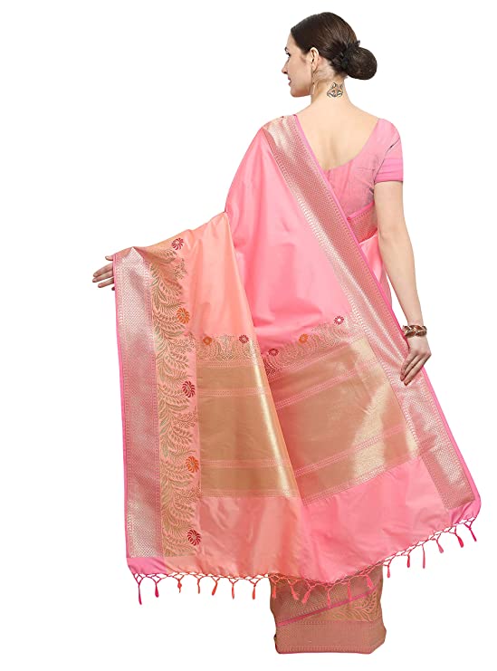 About this Item Saree Details: Saree Color- Baby Pink and Peach, Saree Fabric- Katan Silk, Saree Length- 5.5 m, Print- Floral Design, Work Type- Woven Zari Work Design Blouse Details: Blouse Color- Baby Pink and Peach, Blouse Fabric- Katan Silk, Blouse Length- 0.8 m, Print- Solid, Work Type- Solid With Zari Border Border and Pallu Details: Border Color- Golden and Peach, Border Work Type- Woven Self Design Zari Work Border; Pallu Color- Golden, Pallu Work Type- Woven Rich Brocade Zari Work Pallu With Tassels Wash Care: Dry Clean Only Weave Type: Kanchipuram; Included Contents: With Blouse Piece Additional Information Item Weight670 g Item Dimensions LxWxH5.5 x 1.16 Meters Net Quantity1.00 count Included ComponentsWith Blouse Piece Generic NameWomens Kanchipuram Silk Saree
